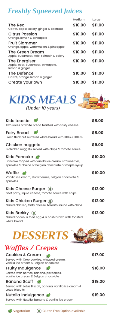 For those with a sweet tooth, the cafe features indulgent waffles and crepes like the Nutella Indulgence ($19) and Fruity Indulgence ($18). Pair your meal with a chilled drink, such as their refreshing Iced Latte ($7).